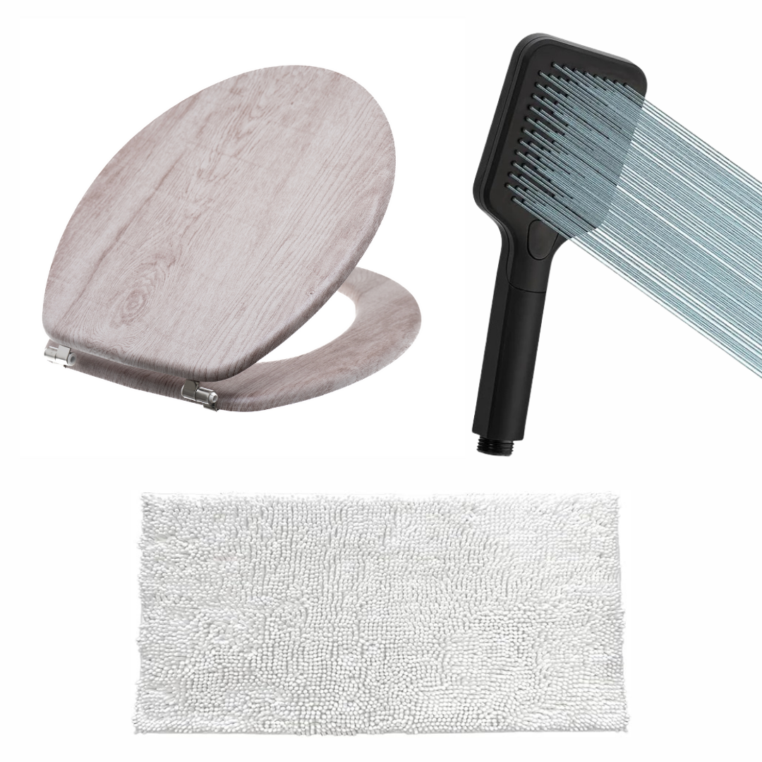 Wooden Toilet Seat, Shower Head & Mat Bundle